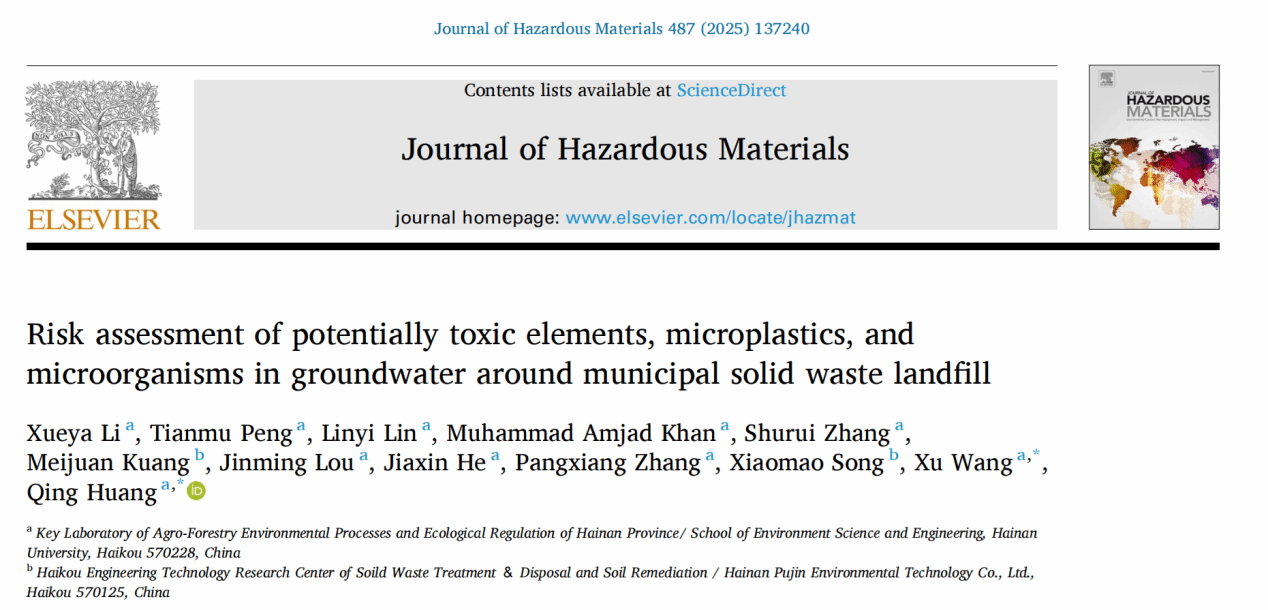 近日,环境领域权威期刊《Journal of Hazardous Materials》(中科院一区TOP,IF2024=12.2)刊发了TapTap黄青研究员团队的最新研究成果“Risk assessment of potentially toxic elements, microplastics, and microorganisms in groundwater around municipal solid waste landfill”。该论文以TapTap官网为第一通讯作者单位,TapTap官网2022级硕士研究生李学雅为该文唯一第一作者,黄青研究员为第一通讯作者,王旭副教授为共同通讯作者。