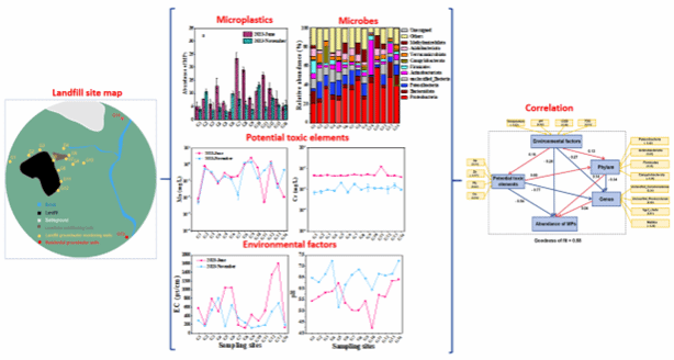 垃圾填埋场的废物渗入地下水中,污染水质,威胁地下水安全,并对生态系统产生负面影响。因此,垃圾填埋场周边地下水中潜在有毒元素(PTEs)、微塑料(MPs)和微生物的风险评估至关重要。本研究探讨了封闭垃圾填埋场周边地下水中PTEs、MPs和微生物的空间和时间变化。结果显示,锰(Mn)和铬(Cr)是地下水中最主要的PTEs,2023年6月的Mn和Cr平均浓度分别是2023年11月的1.16倍和4.51倍。PTEs的风险评估表明,Mn严重污染,Cr中度污染。MPs的丰度在2023年6月的平均值是2023年11月的1.55倍;MPs表明地下水受到更严重的污染,尤其是在下游区域。变形菌门(Proteobacteria)是主要的门类,偏最小二乘路径模型(PLS-PM)显示PTEs与微生物的门类呈正相关,与微生物的属类和MPs的丰度呈负相关。本研究强调了垃圾填埋场环境管理的重要性,为地下水污染的监测和识别提供了新的见解,并为渗滤液污染地下水的修复策略提供了科学指导。